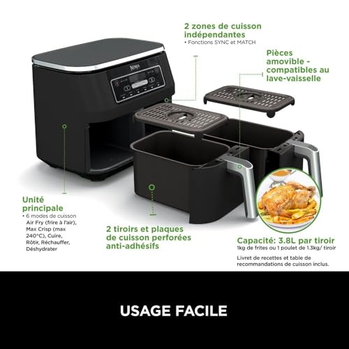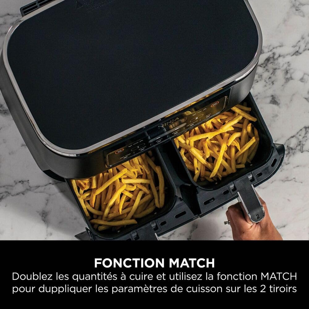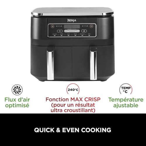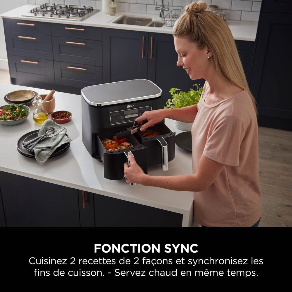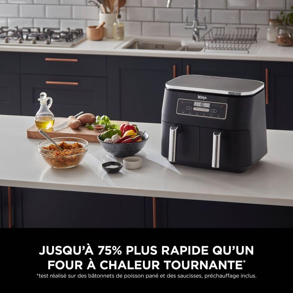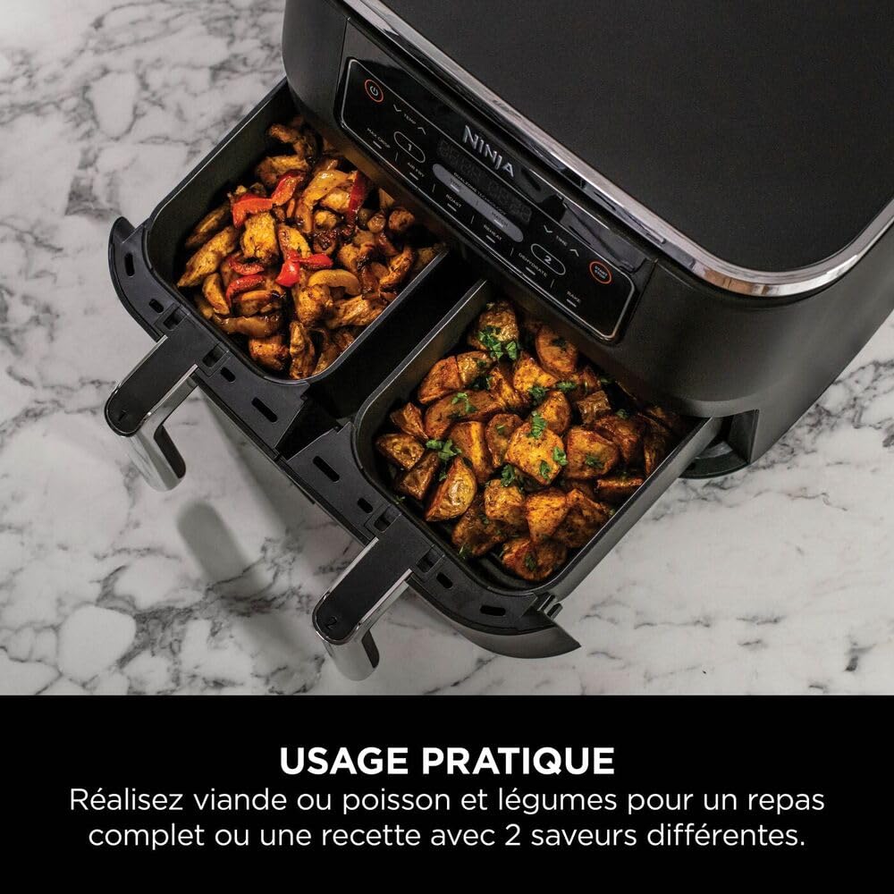 - INCLUS: Ninja Foodi Dual Zone Air Fryer Numerique (prise EU), 2x Tiroirs Antiadhésifs de 3,8 L compatibles Lave-Vaisselle (capacité totale de 7,6 L) et Plaques Croustillantes. Guide de Recettes Créées par des Chefs. Couleur: Noir