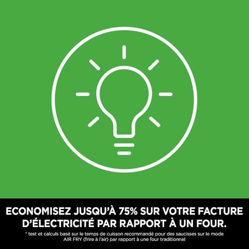 - ÉCONOMIE D’ÉNERGIE: Economisez jusqu’à 75% sur votre facture* (*tests et calculs réalisés sur la cuisson des saucisses en utilisant la friture à l’air par rapport aux fours conventionnels)
