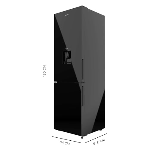 Détails: Réfrigérateur combiné en verre noir, 180 cm de haut et 55 cm de large, d’une capacité de 250 litres, compresseur Inverter Plus, Total No Frost, distributeur d’eau, classe énergétique D et avec système Multi Air Flow. De plus, il dispose d’un mode Fast Cooling et d’un tiroir Humidity Box avec régulation de l’humidité ainsi que d’alarmes d’ouverture de porte et de dysfonctionnement.