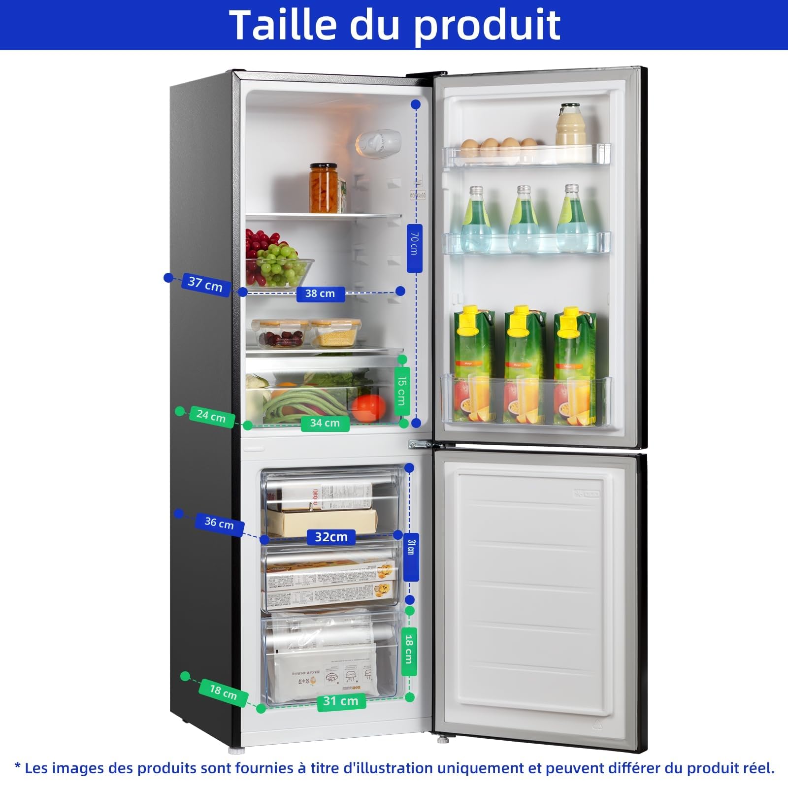 - Humanisé – Ce réfrigérateur combiné est idéal pour une utilisation quotidienne. Le réfrigérateur supérieur vous permet d’accéder aux aliments sans vous baisser, et le congélateur inférieur équipé de 3 tiroirs transparents pour voir facilement ce que vous avez stocké.